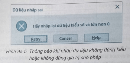 Câu 9a.6: Hình 9a.5 là thông báo xuất hiện khi nhập sai dữ liệu. Thông báo này phù hợp với kiểu dữ liệu nào trong các kiểu sau?
