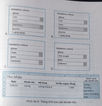 Câu 9a.8: Hình 9a.6 là trang tính lưu các khoản thu của gia đình, trong đó dữ liệu mỗi ô cột Khoản thu (cột B) từ danh sách các khoản thu ở cột F. Em hãy chọn hình ảnh mô tả điều kiện xác thực khi nhập dữ liệu vào mỗi ô tính của cột Khoản thu: