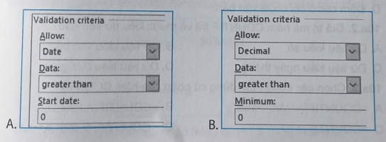 Câu 9a.2: Hãy ghép mỗi mục ở cột A với ý nghĩa của chúng ở cột B sao cho phù hợp khi xác thực dữ liệu.