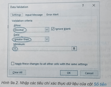 Câu 9a.3: Hình 9a.2 dưới đây là thông tin xác thực dữ liệu đối với cột Số tiền trong bảng tính lưu thông tin chi tiêu của gia đình. Khi đó, dữ liệu nhập vào các ô của cột Số tiền cần thỏa mãn điều kiện gì?