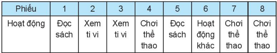 Dãy dữ liệu thu được là: Đọc sách, xem ti vi, xem ti vi, chơi thể thao, đọc sách, hoạt động khác, chơi thể thao, chơi thể thao.