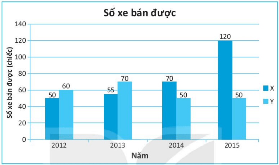 Cho Biểu đồ cột kép kép sau đây biểu diễn số xe ô tô bán được của mẫu xe X và Y trong các năm từ 2012 đến 2015: