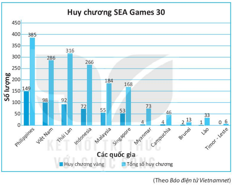 Biểu đồ dưới đây biểu diễn số huy chương vàng và tổng số huy chương của các quốc gia tham dự SEA Games lần thứ 30.