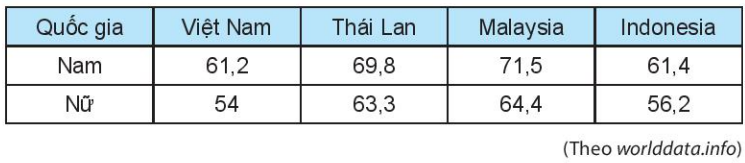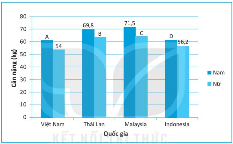 Cho bảng thống kê về cân nặng trung bình (đơn vị kilôgam) của nam, nữ tại một số quốc gia Đông Nam Á như sau: