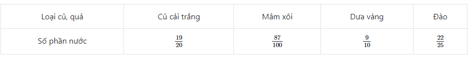 Câu 23. Phân số chỉ số phần nước trong một số loại củ, quả được cho ở bảng sau: