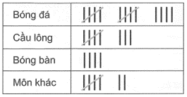 Bảng sau cho biết kết quả bình chọn môn thể thao được yêu thích nhất của các bạn học sinh lớp 9A (mỗi gạch biểu diễn cho một bạn bình chọn):