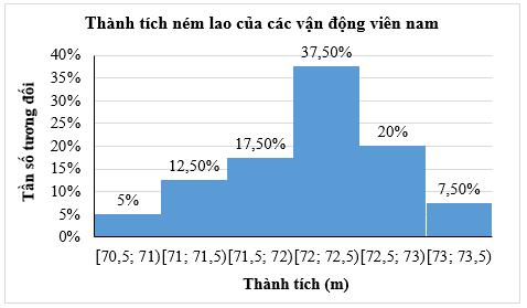 Tỷ lệ số vận động viên nam có thành tích ném lao từ 72 m đến dưới 72,5 m là: ![]()