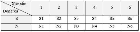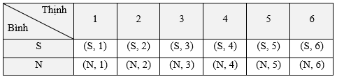 Không gian mẫu Ω = {(S, 1); (S, 2); (S, 3); …; (N, 5); (N, 6)}.