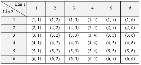 Không gian mẫu Ω = {(1, 1); (1, 2); (1, 3); …; (6, 5); (6, 6)}.