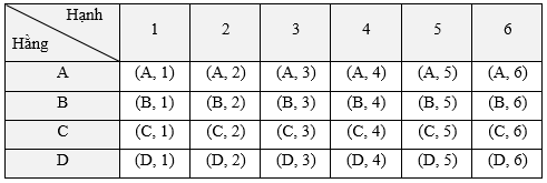 Không gian mẫu Ω = {(A, 1); (A, 2); (A, 3); …; (D, 5); (D, 6)}.
