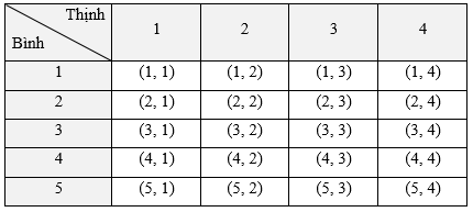 Không gian mẫu Ω = {(1, 1); (1, 2); (1, 3); …; (5, 3); (5, 4)}.