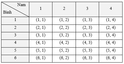 Không gian mẫu Ω = {(1, 1); (1, 2); (1, 3); …; (6, 3); (6, 4)}.