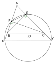 Cho tam giác nhọn ABC có các đường cao BE, CF. Một đường tròn (O) đi qua hai điểm E, F và cắt các tia đối của hai tia BF, CE lần lượt tại X và Y. Chứng minh rằng XY song song với BC.