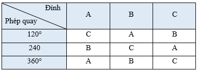 Các phép quay thuận chiều lần lượt 120°; 240°; 360° với tâm O biến các đỉnh A, B, C thành những điểm tương ứng dưới đây: