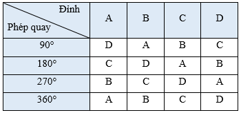 Các phép quay ngược chiều lần lượt 90°; 180°; 270°; 360° với tâm O biến các đỉnh A B, C, D thành những điểm như dưới đây: