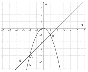Nhìn vào đồ thị, giao điểm của (d) và (P) là hai điểm A(–2; 4) và B(1; –1).