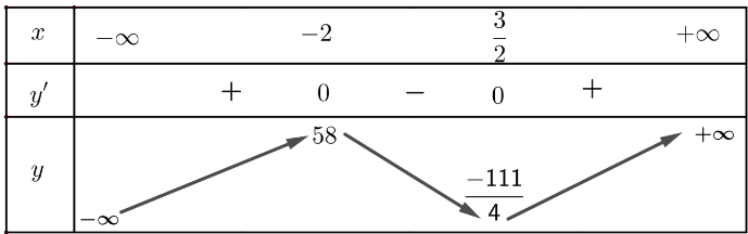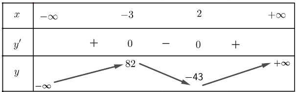 Hàm số đạt cực đại tại x = − 3, giá trị cực đại là f(− 3) = 82; hàm số đạt cực tiểu tại x = 2, giá trị cực tiểu là f(2) = − 43.