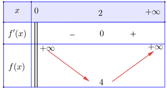 \(\underset{(0;+\infty)}{\min} f(x) = f(2)=4\)