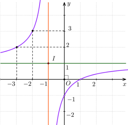 Quan sát hình vẽ, đồ thị đó nhận tâm giao điểm I(- 1; 1) của hai đường tiệm cận của đồ thị làm tâm đối xứng và nhận hai đường phân giác của các góc tạo bởi hai đường tiệm cận đó làm trục đối xứng.