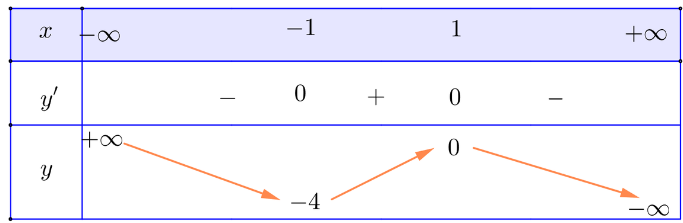 Hàm số đạt cực đại tại x = 1, yCĐ = 0; hàm số đạt cực tiểu tại x = – 1, yCT = – 4.