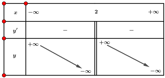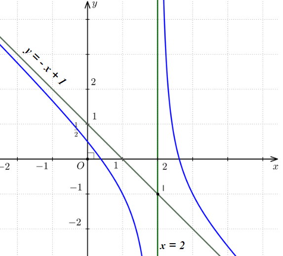 Do đó, đồ thị hàm số có tiệm cận đứng là đường thẳng x = 2 và tiệm cận xiên là đường thẳng y = - x + 1
