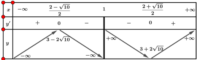 \(\left(\frac{2+\sqrt{10}}{2}; +\infty \right),\)y' > 0 nên hàm số đồng biến trên từng khoảng này.