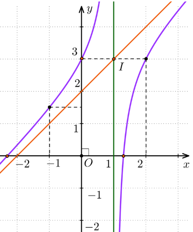 Quan sát hình vẽ, đồ thị đó nhận tâm giao điểm I(1; 3) của hai đường tiệm cận của đồ thị làm tâm đối xứng và nhận hai đường phân giác của các góc tạo bởi hai đường tiệm cận đó làm trục đối xứng.