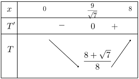 \(T'=\frac{x}{6\sqrt{x^2+9}}-\frac{1}{8} , \ T'=0\Leftrightarrow x=\frac{9}{\sqrt{7} }\)