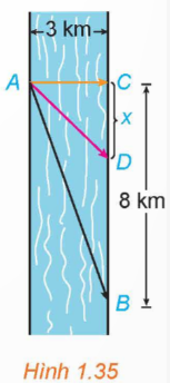 Anh An chèo thuyền từ điểm A trên bờ một con sông thẳng rộng 3 km và muốn đến điểm B ở bờ đối diện cách 8 km về phía hạ lưu càng nhanh càng tốt (H.1.35). Anh An có thể chèo thuyền trực tiếp qua sông đến điểm C rồi chạy bộ đến B, hoặc anh có thể chèo thuyền thẳng đến B, hoặc anh cũng có thể chèo thuyền đến một điểm D nào đó giữa C và B rồi chạy bộ đến B. Nếu vận tốc chèo thuyền là 6 km/h và vận tốc chạy bộ là 8 km/h thì anh An phải chèo thuyền sang bờ ở điểm nào để đến được B càng sớm càng tốt? (Giả sử rằng vận tốc của nước là không đáng kể so với vận tốc chèo thuyền của anh An).