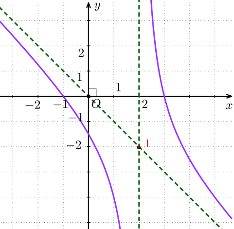 Quan sát hình vẽ, đồ thị đó nhận tâm giao điểm I(2; - 1) của hai đường tiệm cận của đồ thị làm tâm đối xứng và nhận hai đường phân giác của các góc tạo bởi hai đường tiệm cận đó làm trục đối xứng.