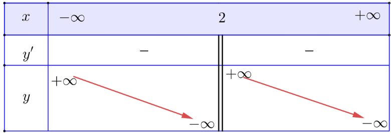 \(\lim_{x\rightarrow2^+}y=-\infty;\lim_{x\rightarrow2^-}y=+\infty\). Do đó, đường thẳng x = 2 là tiệm cận đứng của đồ thị hàm số.