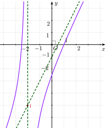 Quan sát hình vẽ, đồ thị đó nhận tâm giao điểm I(− 1; 1) của hai đường tiệm cận của đồ thị làm tâm đối xứng và nhận hai đường phân giác của các góc tạo bởi hai đường tiệm cận đó làm trục đối xứng.