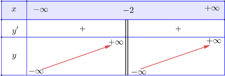\(y'=2+\frac{3}{\left(x+2\right)^2}>0\) với mọi x ≠ - 2