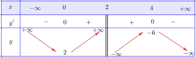 Hàm số đạt cực đại tại x = 4, yCĐ = − 6; hàm số đạt cực tiểu tại x = 0, yCT = 2