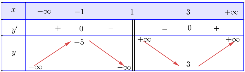 \(y'= 1-\frac{ 4}{\left(x-1\right)^2 }\); y' = 0 ⇔ x = − 1 hoặc x = 3.