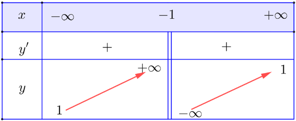 \(y'=-\frac{2}{\left(x+1\right)^2}>0\) với mọi x ≠ − 1