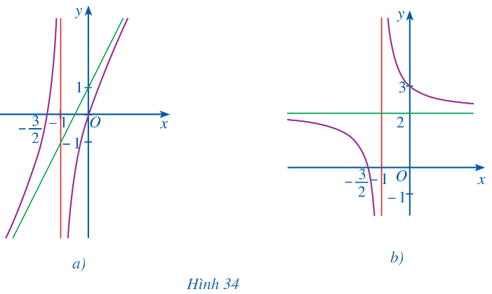 Các đồ thị hàm số ở Hình 34a, Hình 34b đều có đường tiệm cận đứng và đường tiệm cận ngang (hoặc tiệm cận xiên). Hỏi đó là đồ thị của hàm số nào trong các hàm số sau?