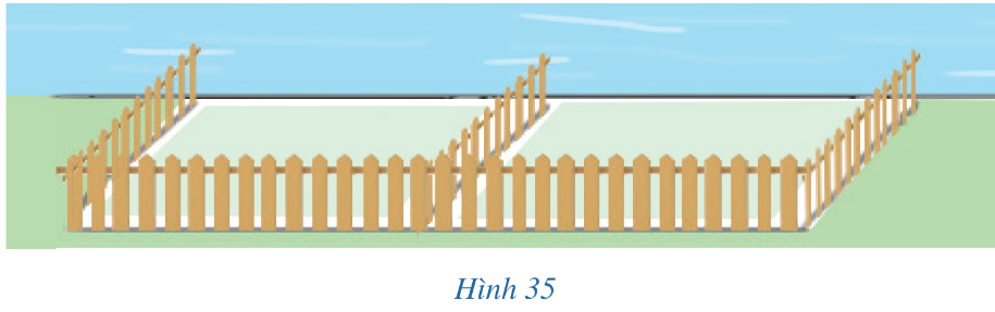 Một người nông dân có 15 000 000 đồng để làm một hàng rào hình chữ E dọc theo một con sông bao quanh hai khu đất trồng rau có dạng hai hình chữ nhật bằng nhau (Hình 35). Đối với mặt hàng rào song song với bờ sông thì chi phí nguyên vật liệu là 60 000 đồng/mét, còn đối với ba mặt hàng rào song song nhau thì chi phí nguyên vật liệu là 50 000 đồng/mét, mặt giáp với bờ sông không phải rào. Tìm diện tích lớn nhất của hai khu đất thu được sau khi làm hàng rào.