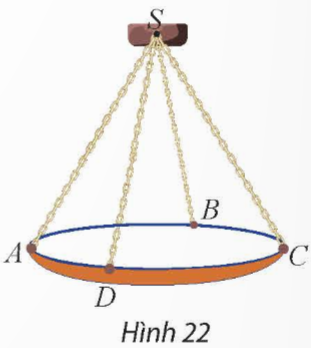 Một chiếc đèn chùm treo có khối lượng m = 5 kg được thiết kế với đĩa đèn được giữ bởi bốn đoạn xích SA, SB, SC, SD sao cho S.ABCD là hình chóp tứ giác đều có