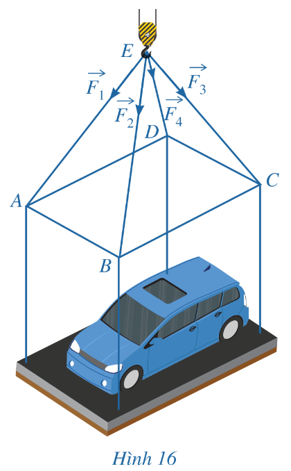Một chiếc oto được đặt trên mặt đáy dưới của một khung sắt có dạng hình hộp chữ nhật với đáy trên là hinhg chữ nhật ABCD, mặt phẳng (ABCD) song song với mặt phẳng nằm ngang. Khung sắt có được buộc vào móc E của chiếc cần cẩu sao cho các đoạn dây cáp EA, EB, EC, ED có độ dài bằng nhau và cùng tạo với mặt phẳng (ABCD) một góc bằng 60o (Hình 16). Chiếc cần cẩu kéo khung sắt lên theo phương thẳng đứng.