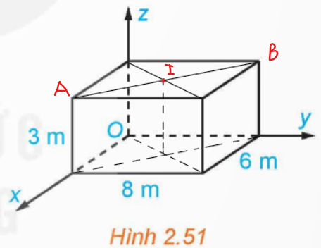 Một phòng học có thiết kế dạng hình hộp chữ nhật với chiều dài là 8 m, chiều rộng là 6 m và chiều cao là 3 m. Một chiếc đèn được treo tại chính giữa trần nhà của phòng học. Xét hệ trục tọa độ Oxyz có gốc O trùng với một góc phòng và mặt phẳng (Oxy) trùng với mặt sàn, đơn vị đo được lấy theo mét (H.2.51). Hãy tìm tọa độ của điểm treo đèn.