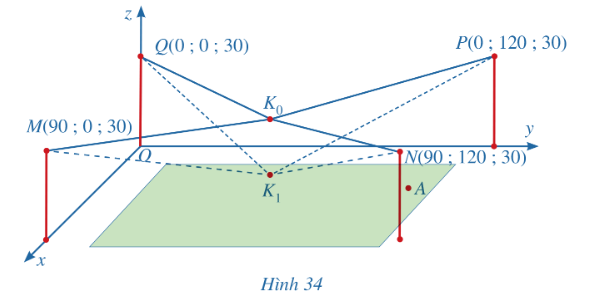 Mô hình thiết kế được xây dựng như sau: Trong hệ trục toạ độ Oxyz (đơn vị độ dài trên mỗi trục là 1 m), các đỉnh của bốn chiếc cột lần lượt là các điểm M(90; 0; 30), N(90; 120; 30), P(0; 120; 30), Q(0; 0; 30) (Hình 34).