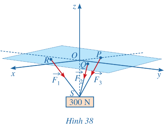 Một vật có trọng lượng 300 N được treo bằng ba sợi dây cáp không dãn có chiều dài bằng nhau, mỗi dây cáp có một đầu được gắn tại một trong các điểm P(– 2; 0; 0), Q(1;