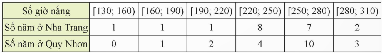 Bảng sau thống kê lại tổng số giờ nắng trong tháng 6 của các năm từ 2002 đến 2021 tại hai trạm quan trắc đặt ở Nha Trang và Quy Nhơn.