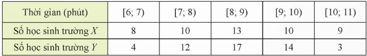 Thời gian hoàn thành một bài viết chính tả của một số học sinh lớp 4 hai trường X và Y được ghi lại ở bảng sau: