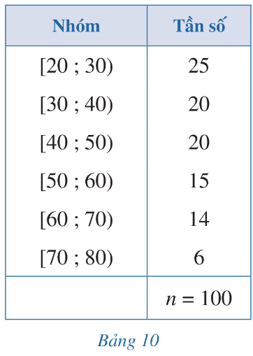Bảng 10 biểu diễn mẫu số liệu ghép nhóm về độ tuổi của cư dân trong một khu phố.