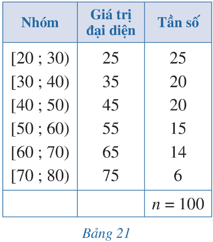Bảng 21 biểu diễn mẫu số liệu ghép nhóm về tuổi của cư dân trong một khu phố. Tính phương sai và độ lệch chuẩn của mẫu số liệu đó.