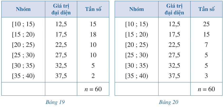 Bảng 19, Bảng 20 lần lượt biểu diễn mẫu số liệu ghép nhóm thống kê mức lương của hai công ty A, B (đơn vị: triệu đồng).