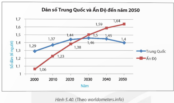 Biểu đồ đoạn thẳng Hình 5.40 cho biết số dân và dự báo quy mô dân số của Trung Quốc và Ấn Độ đến năm 2050.
