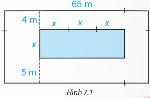 Trên một mảnh đất hình chữ nhật có chiều dài 65 m, người ta định làm một bể bơi có chiều rộng là x mét, chiều dài gấp 3 lần chiều rộng. Sơ đồ và kích thước cụ thể (tính bằng mét) được cho trong Hình 7.1 Tìm đa thức (biến x):